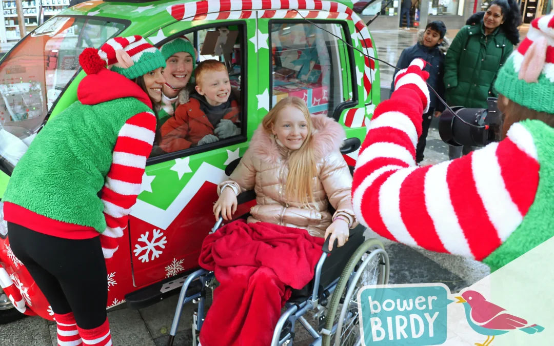 Elf Car Christmas Magic in Stevenage: A boy and a Bowerbirdy elf inside the Elf Car, and a Bowerbirdy Elf and a girl in a wheelchair outside of the Elf Car all smile for a photo, being taken by a third elf.