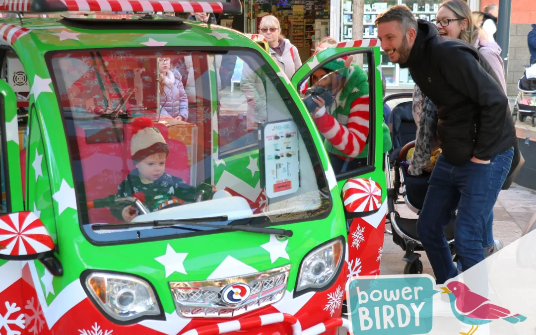Elf Car Christmas Magic in Stevenage: A dad smiles watching his young son sitting in in the Elf Car playing with the steering wheel.